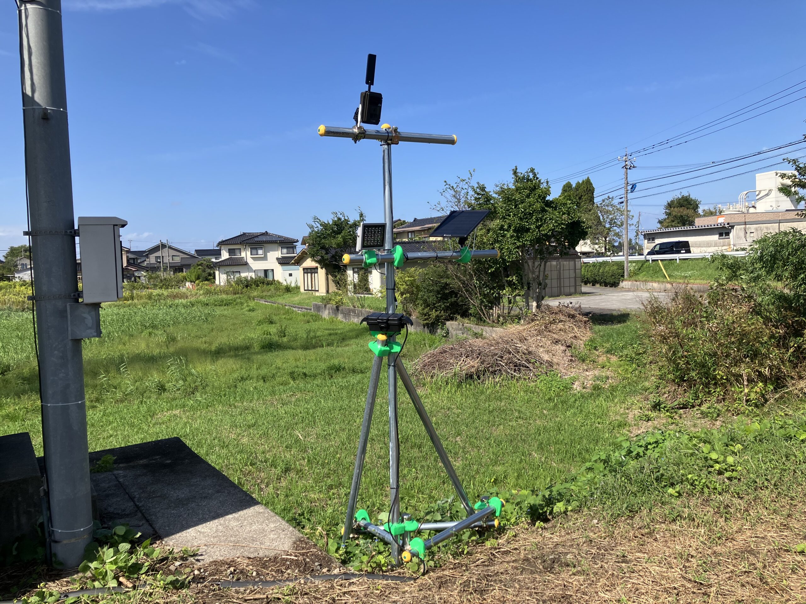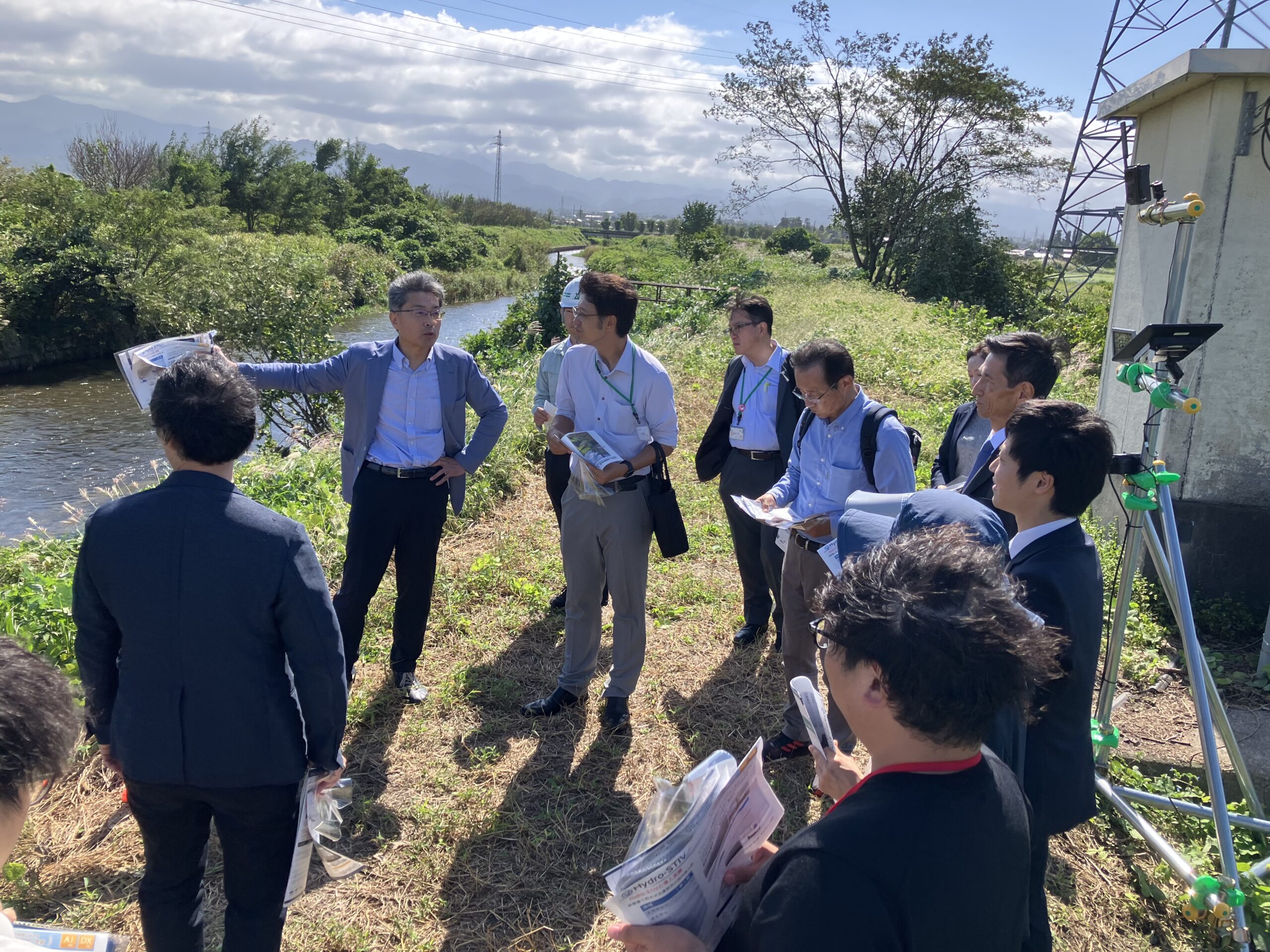 株式会社ハイドロ総合技術研究所の発表に先立ち、流量観測場所である栃津川流観橋を視察しました。 観測用撮影機材である、トレイルカメラ・赤外線LED・ソーラーバッテリーが設置されており、カメラで撮影した映像 をSTIV技術により解析することで、非接触での流量観測が可能となります。実際の観測場所において、従来の人力による観測作業の大変さや、既設カメラの問題点を確認し、課題や実証実験内容への理解が深まりました。