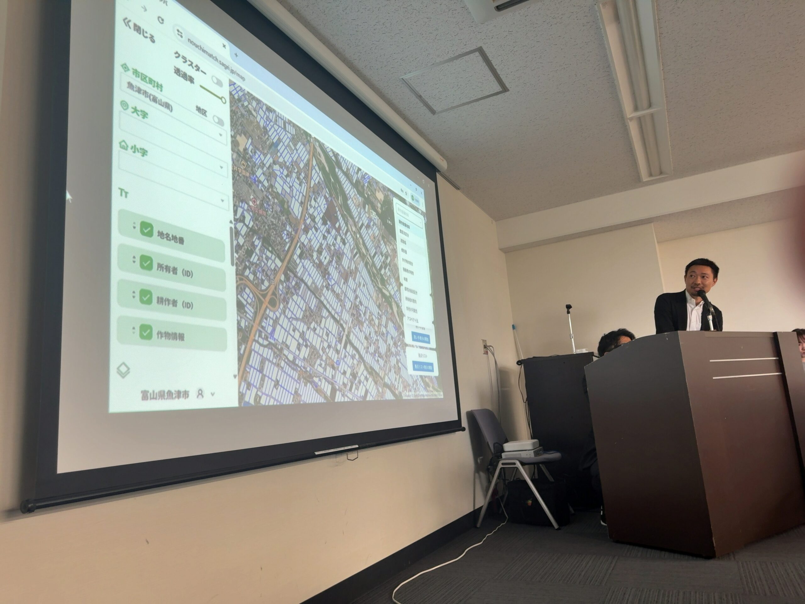 衛星データや各種オープンデータを統合した地図サービス「ニナタバ」を用いて、現在富山県下3自治体をフィールドとして、農地の可視化を実施中です。 今後、可視化した情報を元に重点地区を設定し、農業法人等10社以上へヒアリングを行い、県内初のマッチング事例創出に向けて、体制整備を行っていきます。